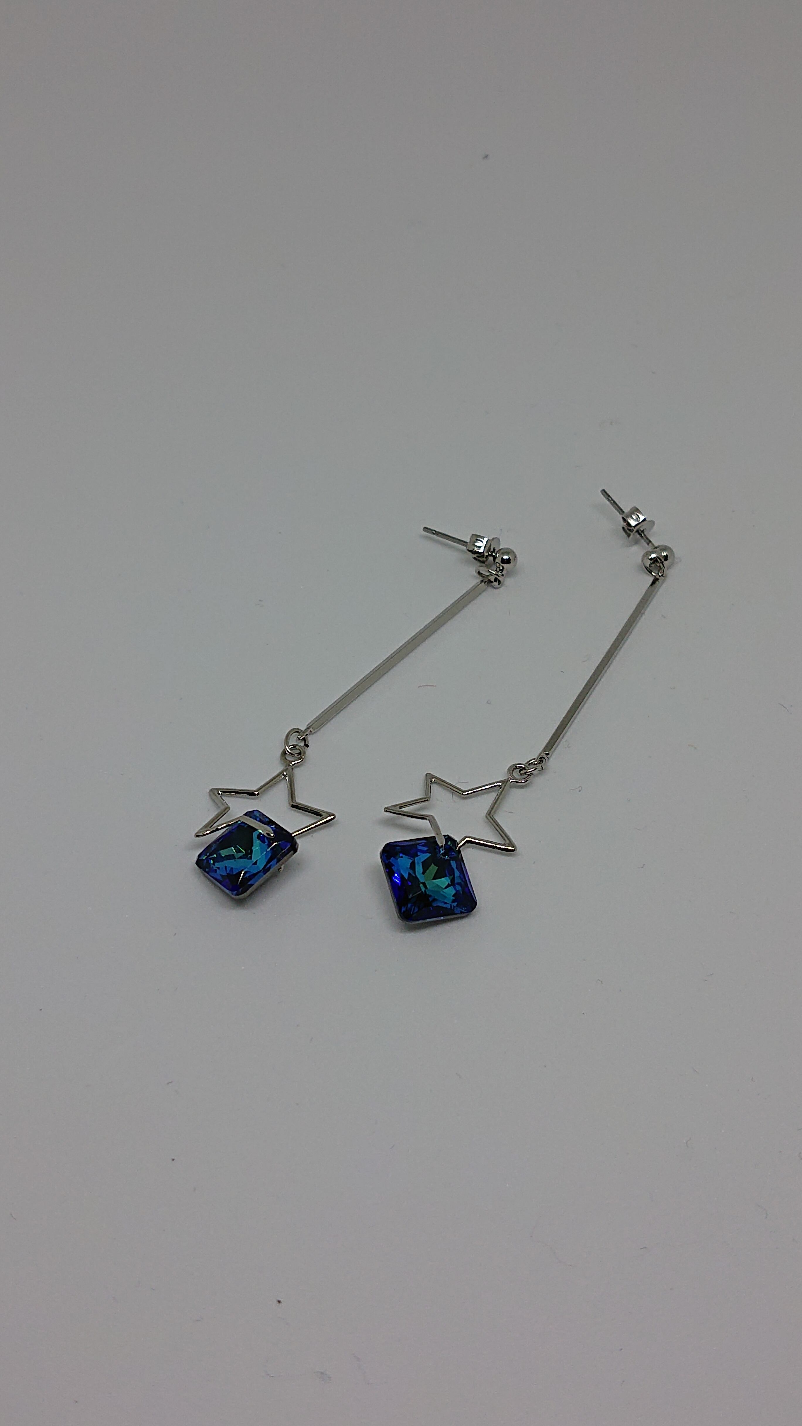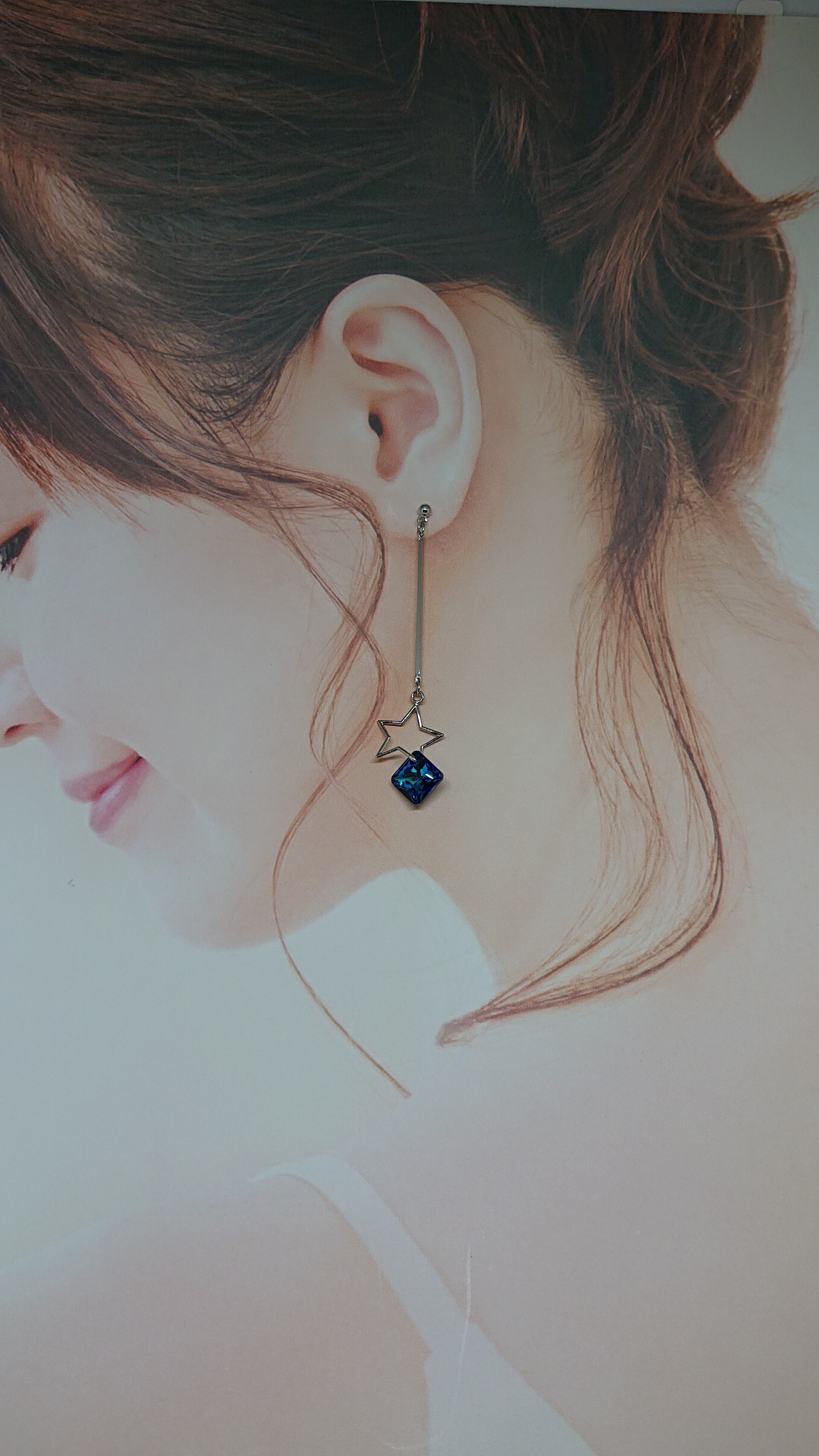 ぶら下がりの長さ、全長約6.5cmで 星型のチャームに スワロをぶら下げました。 こちら、ピアスとなっておりますが、イヤリング、ノンホールピアスへの変更、可能です。