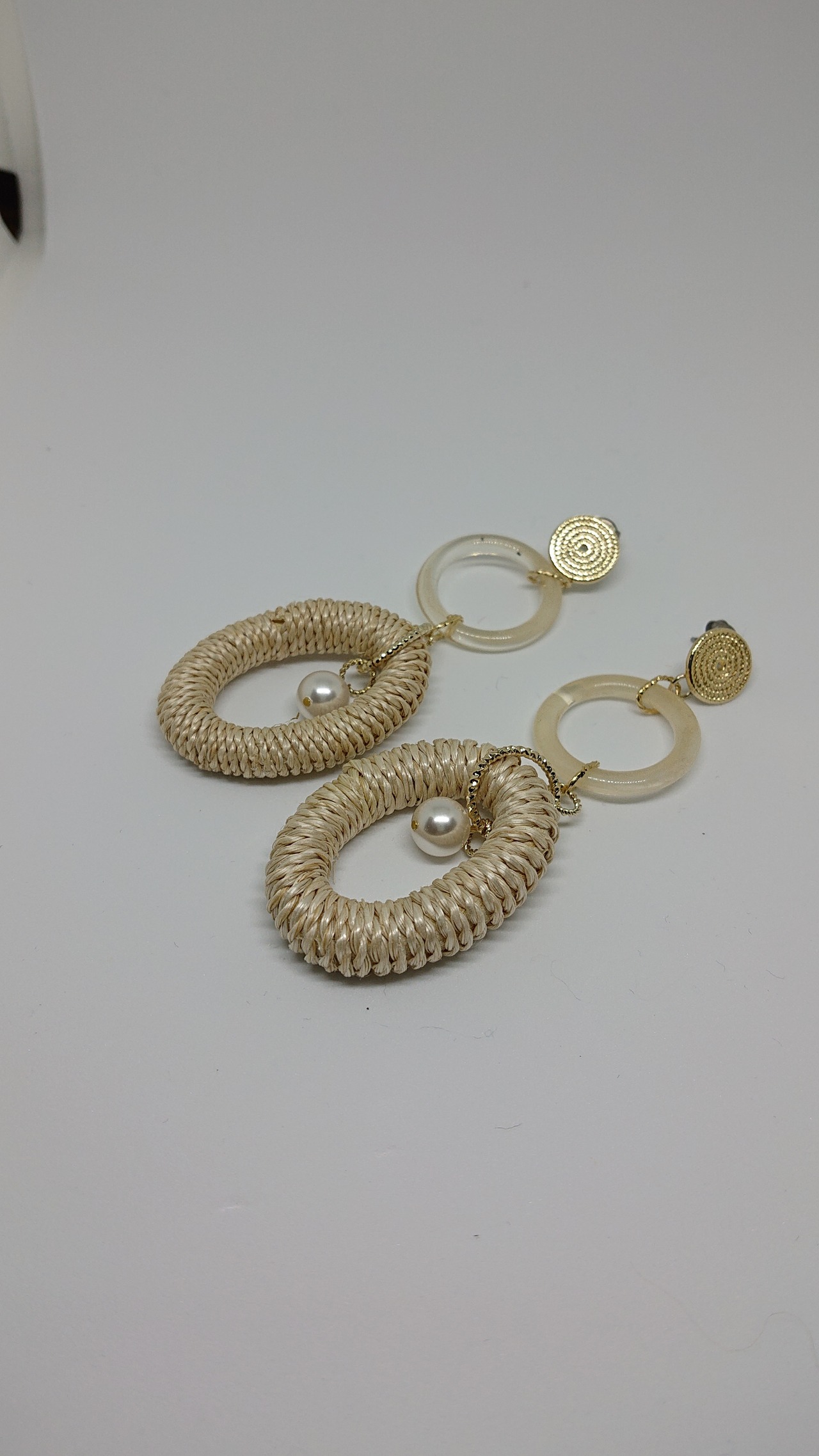 天然麻を使ったリングの中に パールをぶらさげ、アクリルリングを繋げ、ゆらゆら感を出しました。