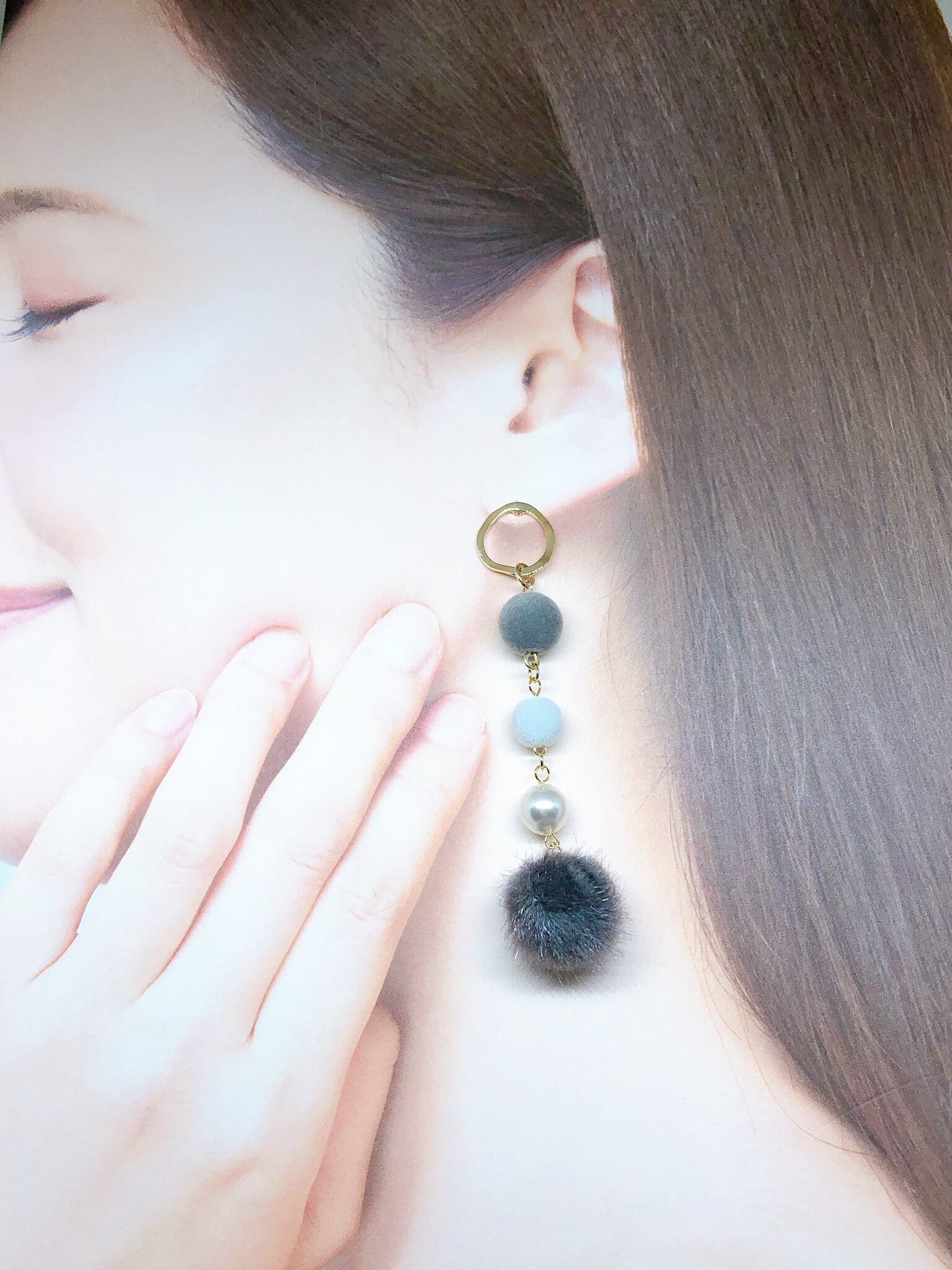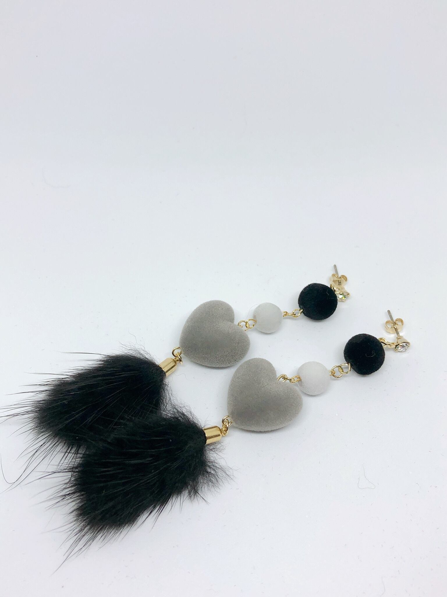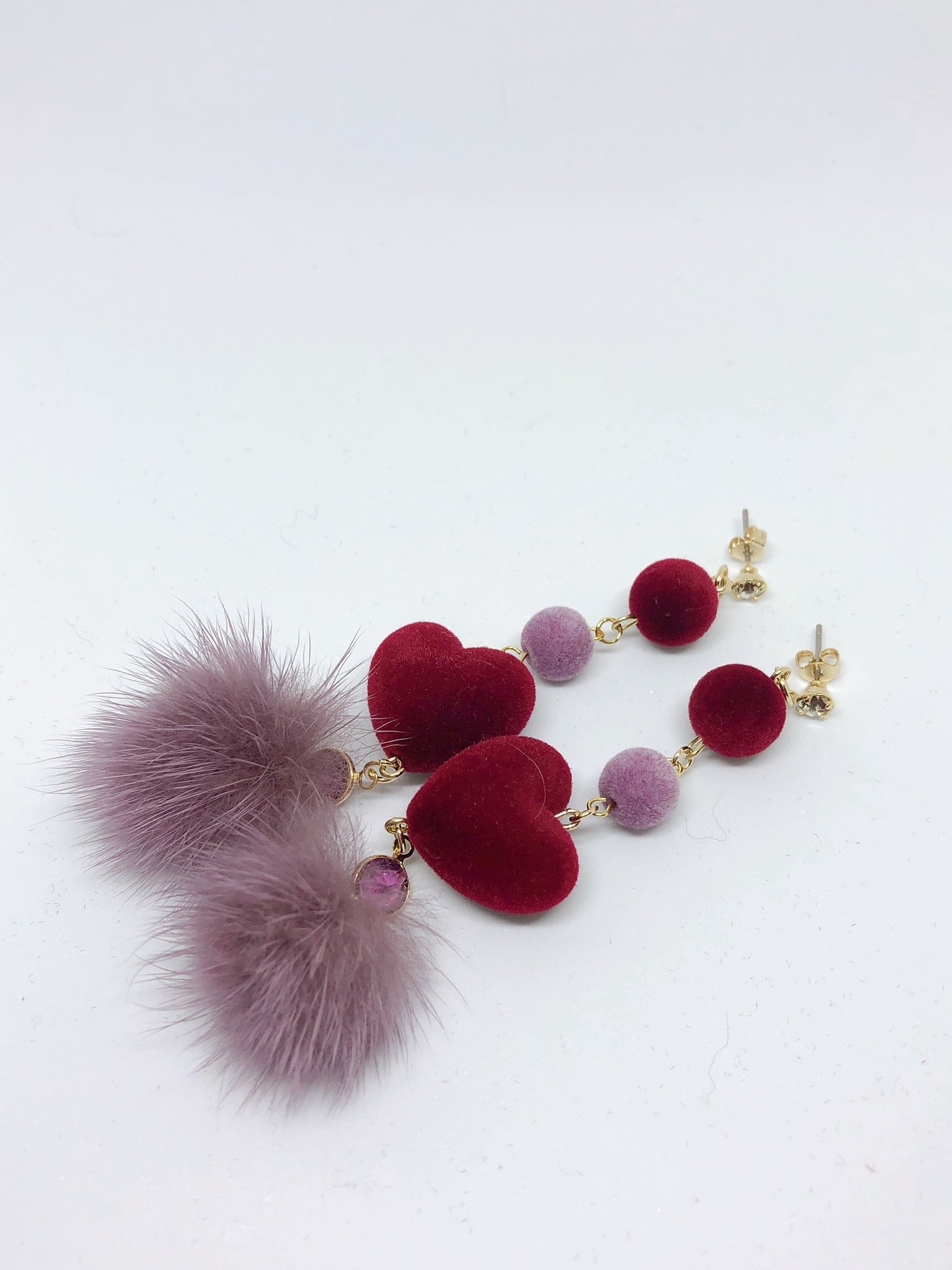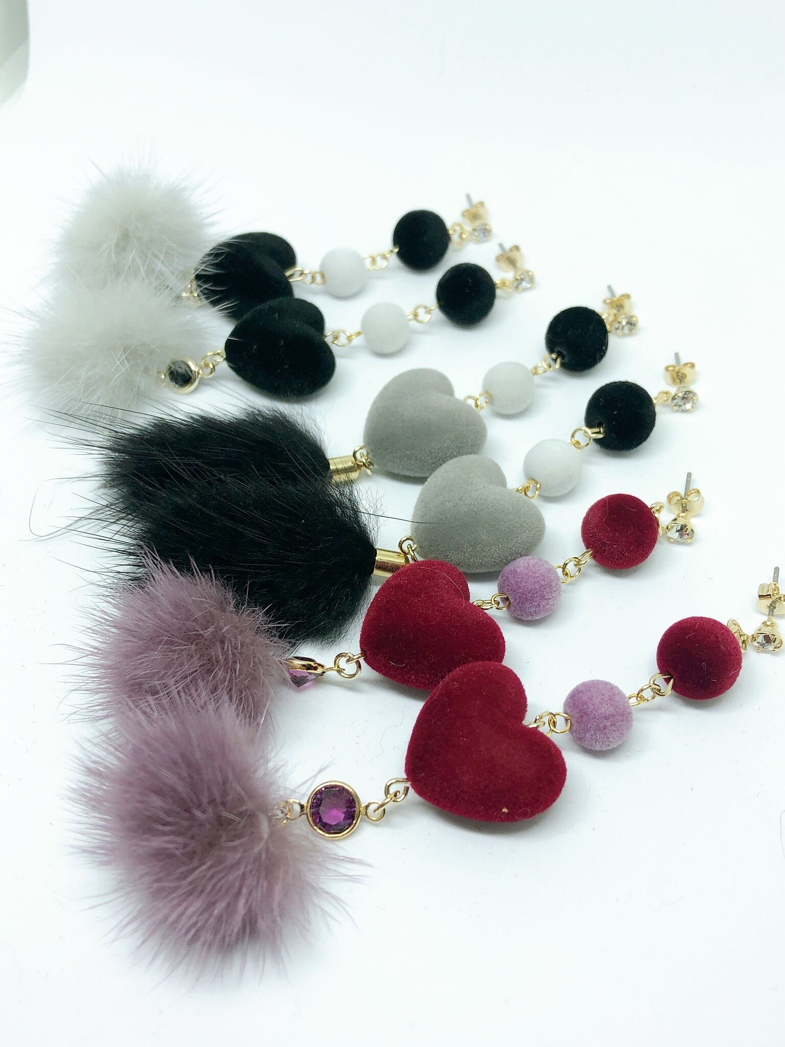 こちらは フロッキーの丸玉のサイズ、色違いを組み合わせ、アクセントにハート型のフロッキーを入れ、ミンクファーをぶら下げました。